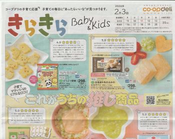 コープデリの子育て応援カタログは、「きらきらBaby&Kids」。毎週発行。8ページ。離乳食、幼児食、ミルク、オムツの他、本や雑貨類も掲載されています。