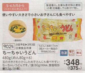 1個の大きさを小さくしたうどん。麺も細めで、短いので離乳食に使いやすいです。値段はコープデリが375円、パルシステムが354円でパルシステムが21円安いです。