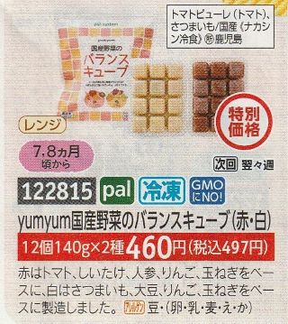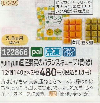 パルシステムの子育て応援カタログは「yum yum」(ヤムヤム For Baby&kids)。毎週発行。8ページ(12ページの時もあります)。離乳食、幼児食、ミルク、オムツの他、本や雑貨類も掲載されています。