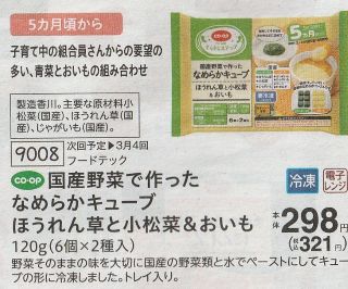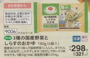離乳食に便利な商品3品とガイドブックがセットになっています。コープデリでは、5~6か月頃1073円と7~8か月頃と1105円の2種類。パルシステムでははじめてセットを991円で取り扱っていました。