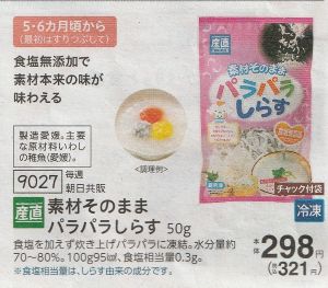離乳食ではしらすは少量しか使わないので、冷凍で日持ちするしらすは便利ですよね。コープデリのしらすは食塩抜きなので、塩抜き無しで使うことが出来ます。100gあたりの価格はコープデリが642円で、パルシステムが544円です。