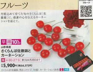 イオンの母の日のさくらんぼ。佐藤錦、秀Lサイズ16個+カーネーションで6372円。