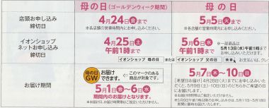 イオンは4/28までに申し込みをすれば、5/9(土)、5/10(日)のいずれかの希望日に配達が可能。(配達時間帯の指定は出来ません)