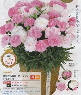 パルシステムのカーネーション人気NO1の商品。咲き始めはやわらかなライトピンクで次第に淡く色が変わる品種。5号鉢で、早割価格で4158円(税・送料込)