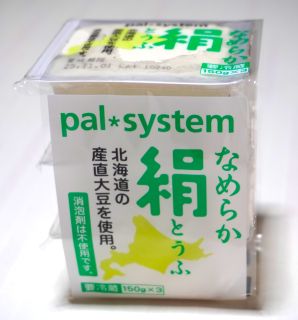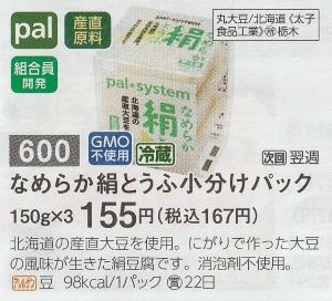 なめらか絹とうふは国産大豆を原料に使っているのが特徴。 イオンで扱っている国産原料の豆腐は「北海道産ゆきほまれ絹豆腐」で、150g×3で116円。違いはパルシステムは消泡材不使用、イオンは使用、くらいです。国産大豆の豆腐はイオンのほうが安いです。