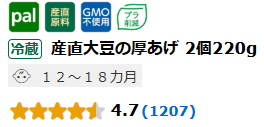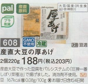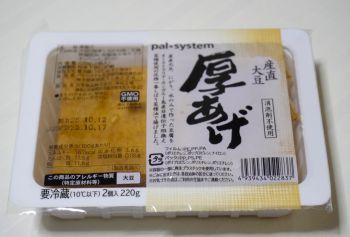 この厚揚げ、大のお気に入りでパルくる便に登録して定期的に買っています。大豆の豆の柔らかい甘みを感じられます。お陰で他では厚揚げ買えません(笑)