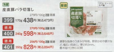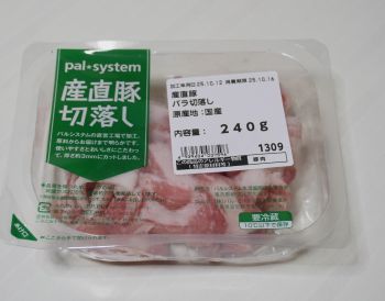 イオンでは国産バラ切落しが500gで1058円。100gあたりの値段はパルシステムが269円でイオンが211円。豚バラ切落しはイオンのほうが安いです。