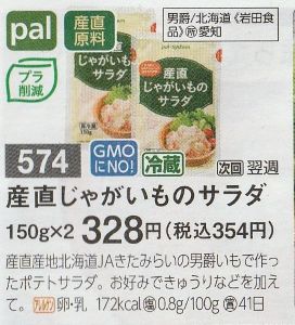 イオンの「海道産じゃがいものポテトサラダ」は120gで138円。100gあたりの価格はパルシステムが109円、イオンが115円でパルシステムのほうが安いです。