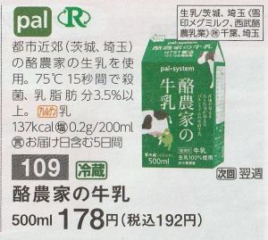 パルシステムの「酪農家の牛乳」は、殺菌温度が低めの「HTST殺菌」が特徴。イオンには低めの殺菌温度で500mlの牛乳の取り扱いはありませんでした。(イオンでは1000mlなら低温殺菌の扱いがあり358円、パルシステムは311円です)